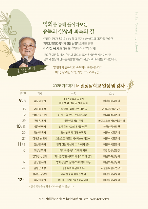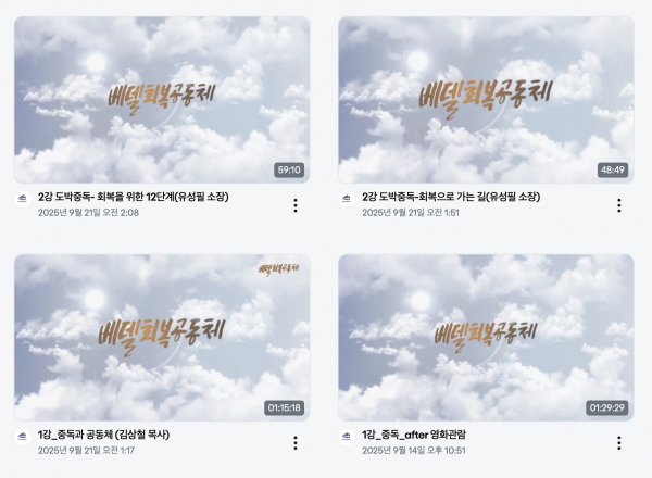 이달 9월에 시작된 베델상담학교 과정은 은혜롭게 출발했다. 처음에는 교회 밖을 향해 공개적으로 열 계획이었으나, 하나님께서 아직 때가 아님을 알려주셔서 성도들을 중심으로 진행하게 되었다. 이 과정은 1년에 두 학기씩 3년간 이어지며, 마치고 나면 대부분이 엘리엇 테퍼가 말한 ‘베텔리토’로 성장할 것이다. 내일은 3주 차 강의에 들어간다.